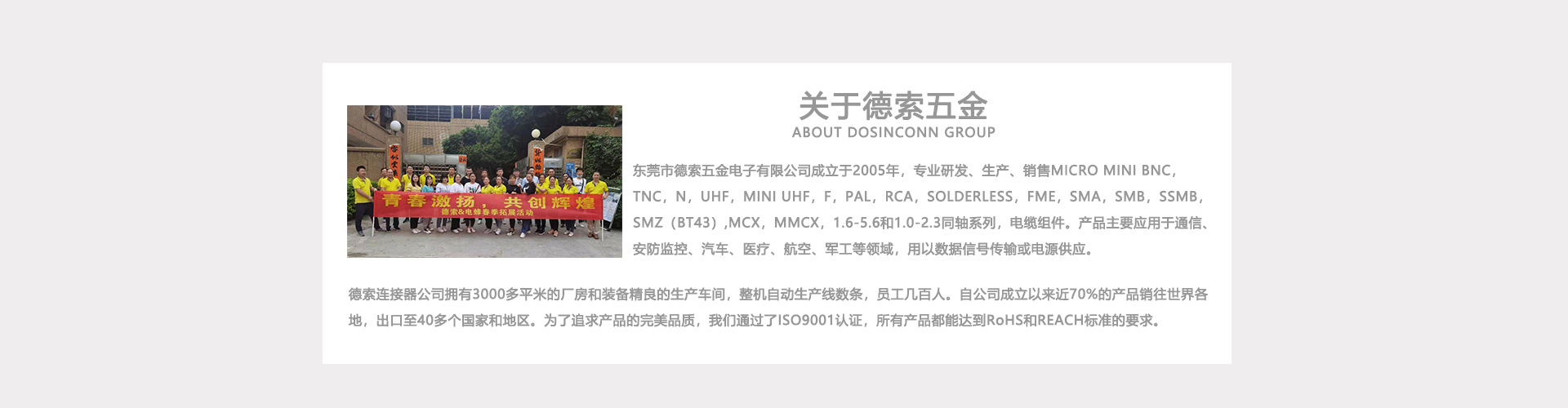 德索五金電子,專業生產研發各種BNC、SMA產品,包含了連接器、線材、轉接頭等,十三年的BNC接頭生產經驗,ISO認證品質,并享受一年內質保服務,客戶朋友可以放心采購。廠家直供,真材實料,交貨及時,口碑卓越!